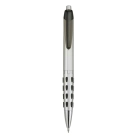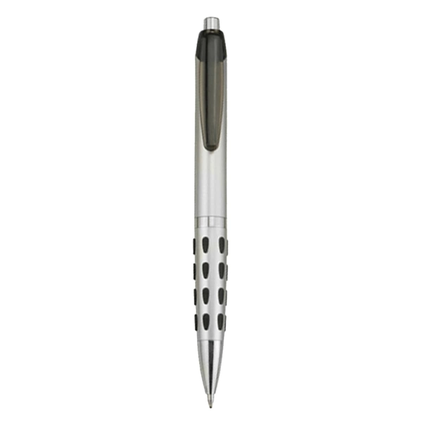 Retractable action plastic pen matt silver barrel with gloss silver chromed fittings and coloured dotty grip and transparent clip high quality German manufactured black ink refill and tungsten carbide ball which brings you the better writing quality 1200 meters writing distance.