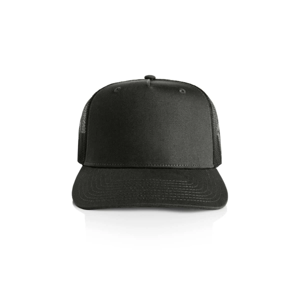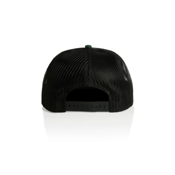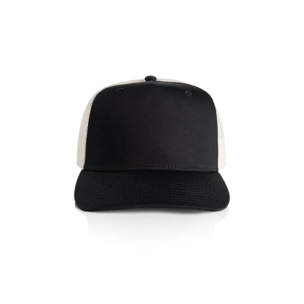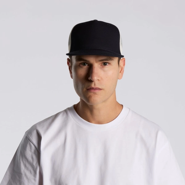 Discover the AS Colour Stock Contrast Trucker Cap: A high-profile snapback with a flat peak, crafted from mid-weight 100% cotton front and peak, complemented by a breathable 100% polyester mesh back in a contrasting color. Includes a plastic snapback closure, tonal under-peak lining, and tear-out AS Colour label.