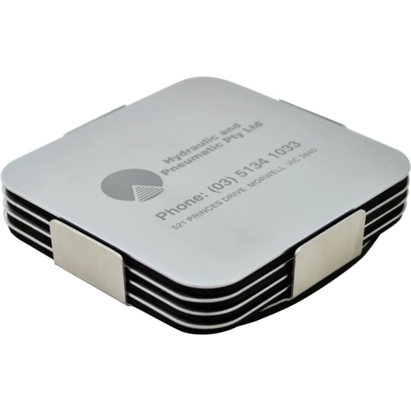 This stylish 4-piece coaster set is ideal for use in a meeting room or boardroom. Made from stainless steel and laser engraved with your logo, each coaster features a rubberised non-slip base.