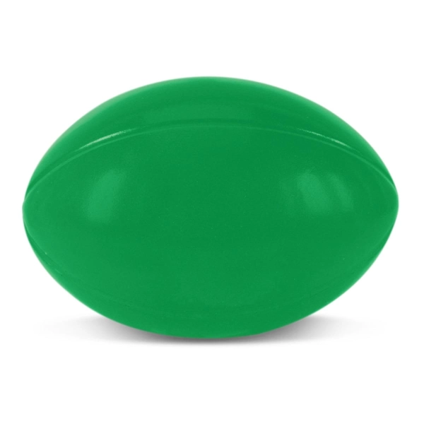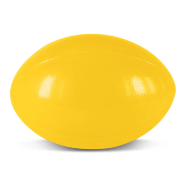 Rugby ball shaped squeezable stress reliever made from soft polyurethane.