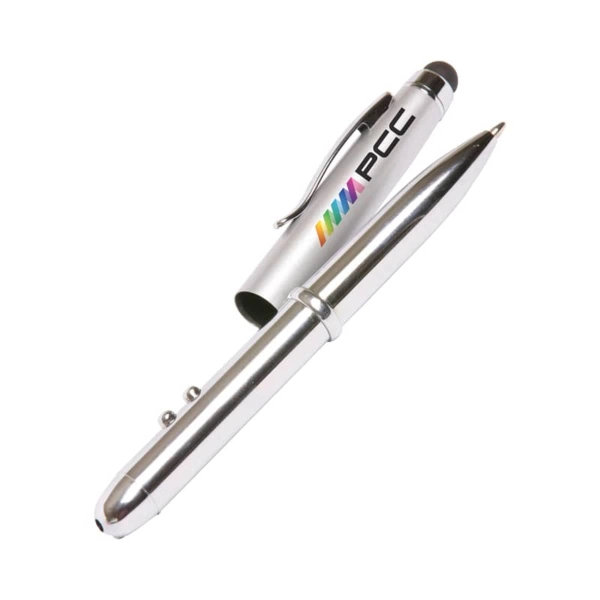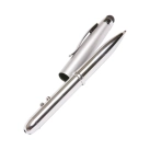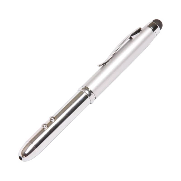 Chrome plated laser pointer with LED torch, black ball point pen and stylus, power output < 1mW (Class II), wavelength 650nm, 3 flat cell batteries (LR-41)
