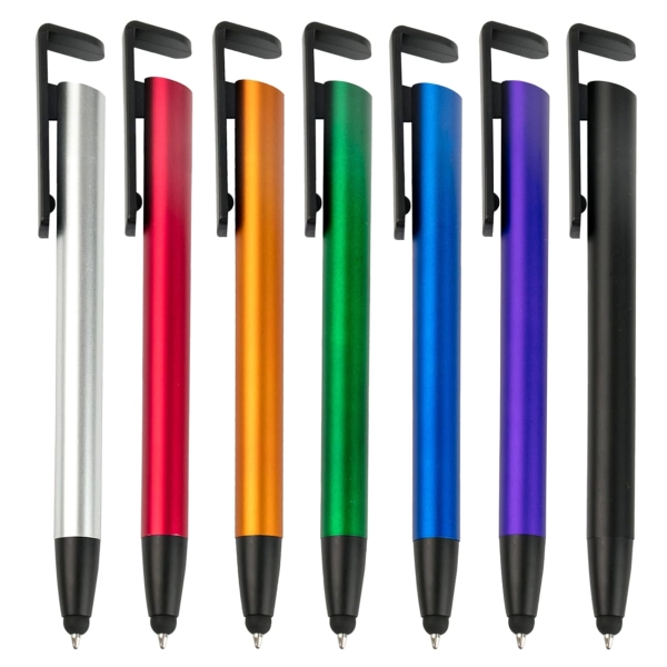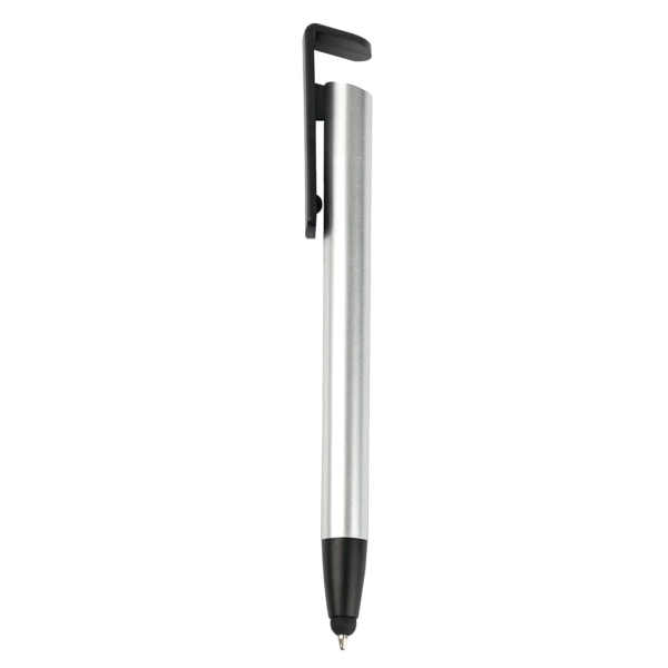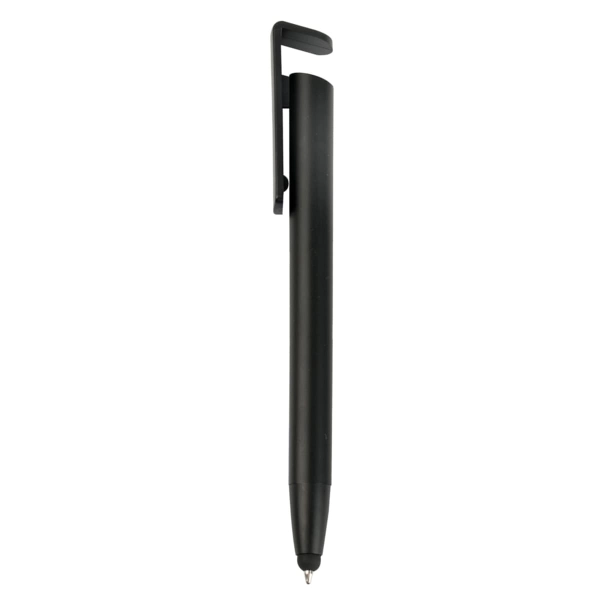 3 in 1 plastic stylus mobile phone stand pen take this pen with you you will have a mobile phone stand any time any where. Click action with metallic coloured barrel with stylus for touch screen and black clip and tip broad printing area on clip plastic Parker-Type German manufactured black ink refill 1200 meters writing distance tungsten carbide ball provides you with quality writing.