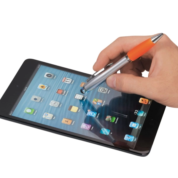 Twist action plastic pen with silver barrel and rubberized soft-touch grip shiny silver chrome trim and a stylus for touch screens one of most popular promotional pens. It has high quality cross-type German manufactured black ink refill 800 meters writing distance tungsten carbide ball provides you with quality writing.