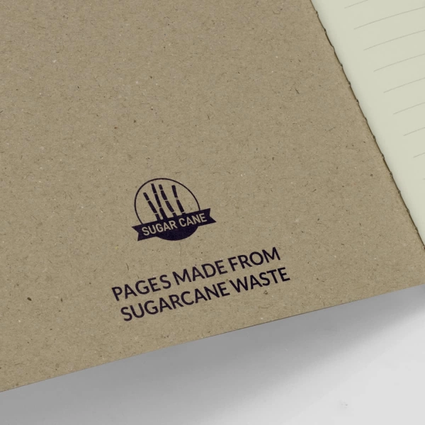 Stylish and functional medium-sized (approximately A5) notebook with a soft kraft cover. The notebook features 40 leaves (80 pages) of 70gsm lined cream paper made using sugarcane waste, with a sugarcane logo printed on the inside cover and the corner of each page.