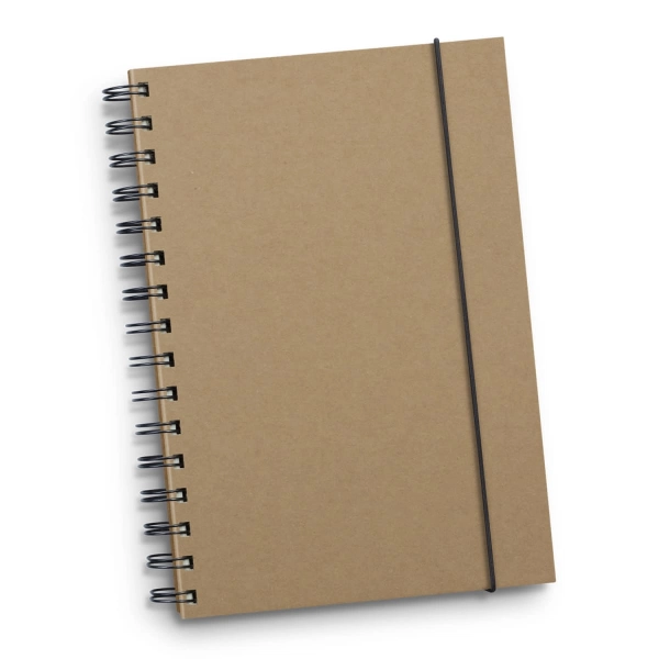 Stylish and functional medium-sized (approximately A5) wiro-bound notebook with a hard kraft cover. The notebook features 80 leaves (160 pages) of 70gsm lined cream paper made using sugarcane waste, with a sugarcane logo printed on the inside cover and the corner of each page. An elastic closure helps to keep notes secure.