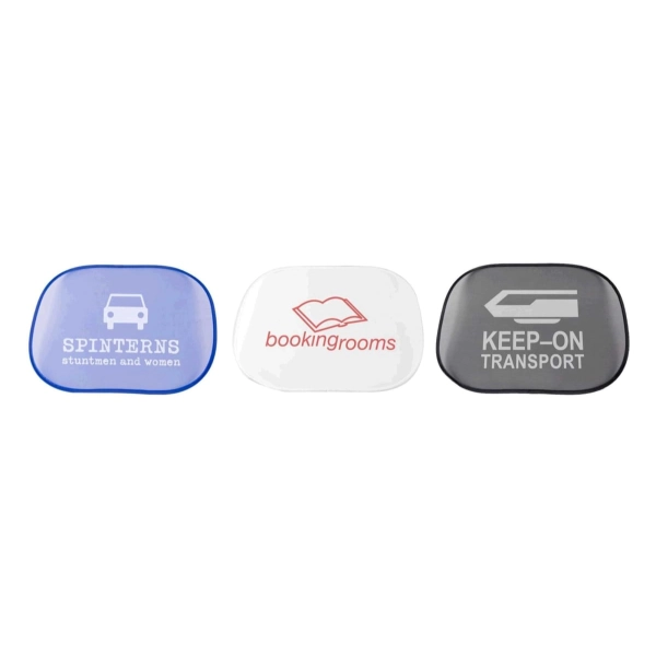 This handy rear side window sun-shade is the ideal spot for an advertising message. This sun-shade folds down to 16 cm for storage. Each shade is supplied with 2 removable suction cups.
