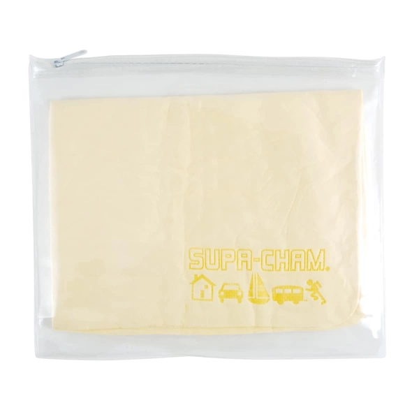 Experience superior drying with our Supa Cham Chamois in Pouch. This synthetic pre-wet chamois is perfect for cars, boats, and more. Its debossed "Supa Cham" logo adds a touch of quality, while the included clear PVC pouch keeps it safe and ready for use.