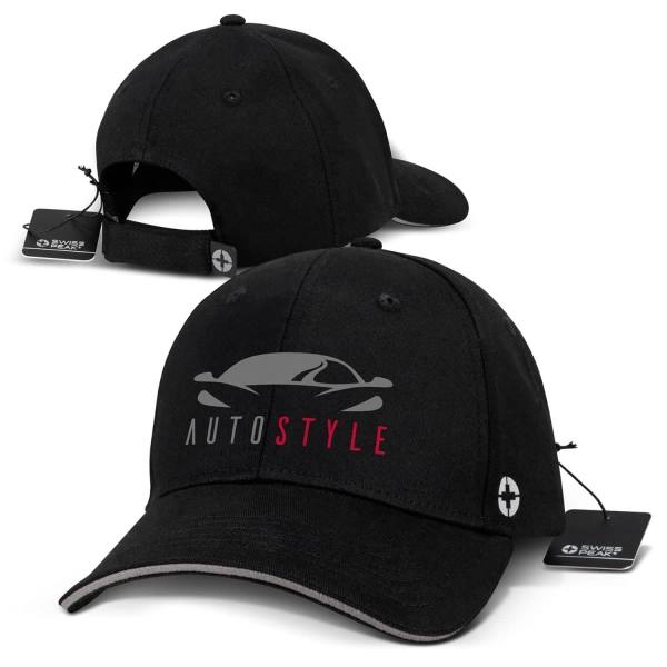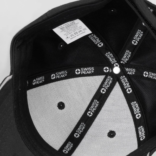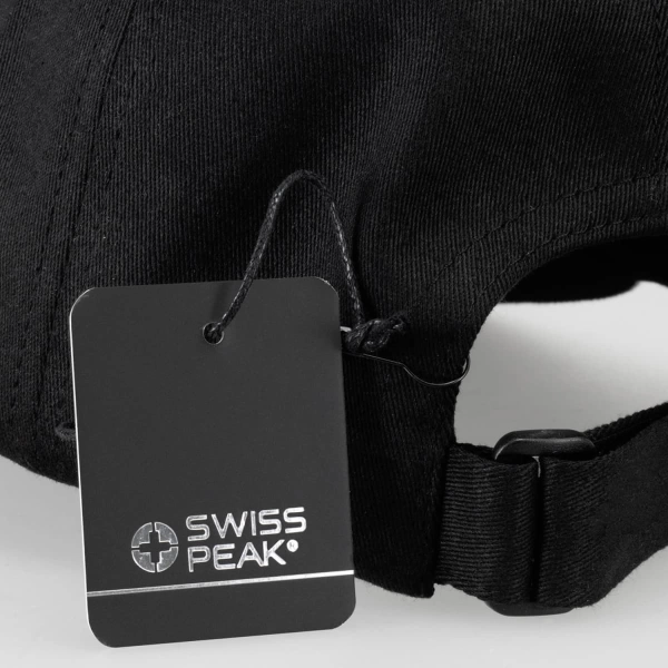 Swiss Peak's deluxe six panel hat is made of a soft blend of 98% cotton and 2% spandex. The hat features an adjustable Velcro strap with a silicone pull tab, grey accents, and custom Swiss Peak bias tape interior. Available in one size to fit most people, the hat sports a reflective Swiss Peak logo and hang tag.
