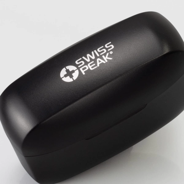Three different eartip sizes are included to ensure a comfortable fit for most users. Additionally, the earbuds are equipped with built-in controls for adjusting volume, selecting tracks, and handling calls. The earbuds are elegantly presented in a black gift box with Swiss Peak branding, making them an ideal gift for any music enthusiast.