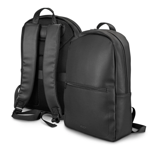 Make your daily commute easier with this premium Swiss Peak structured backpack manufactured from soft vegan leather (100% PU) with a 210D polyester interior. Main features include a 15.6-inch laptop pocket, a luggage strap, an internal zip pocket, and a top zip closure. The backpack also features adjustable shoulder straps and a top carry handle. The Swiss Peak logo is debossed on the front bottom of the bag.