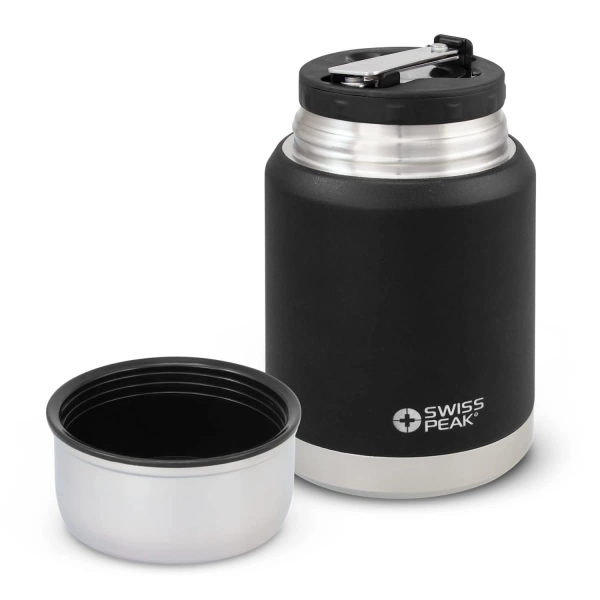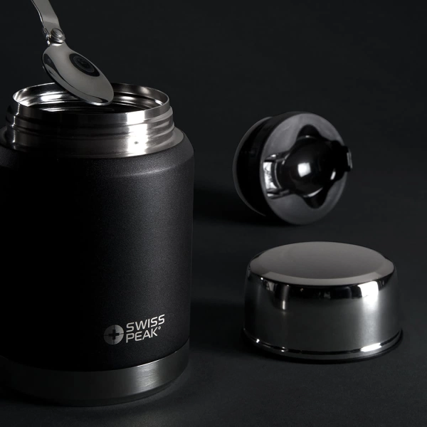 Premium 500ml double wall, vacuum insulated stainless steel food flask. It has a unique copper lining on the inner wall which improves its performance and the outer wall has a tough powder coated finish. Elite will keep food hot for up to 12 hours and cold for up to 24 hours. It has a screw on serving bowl and a foldable stainless steel spoon which snaps securely into the lid. This precision vacuum flask is BPA-free and laser engraves to a shiny steel finish. It is presented in a Swiss Peak gift box with an information leaflet included. This product is not dishwasher safe and handwashing is recommended.