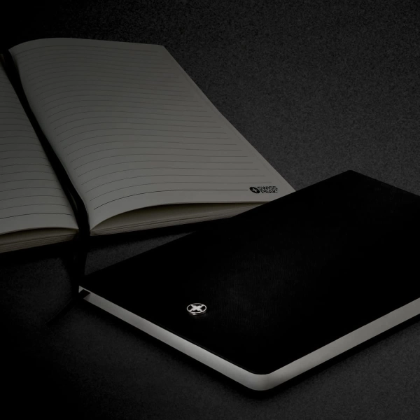 Exceptional medium-size Swiss Peak notebook with 80 leaves (160 pages) of 80gsm lined cream paper and a bookmark ribbon. It has a hard cover which is finished with textured leather look PU. There is a 3D Swiss Peak badge on the front cover and the brand is tastefully debossed on the back cover and printed in the corner of each page. The notebook is beautifully presented in a Swiss Peak gift box.