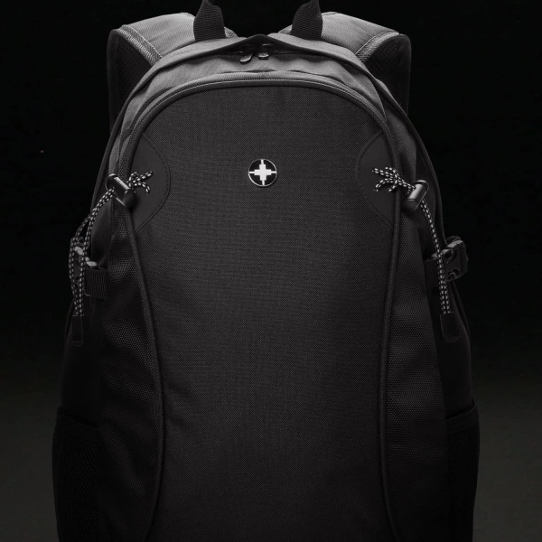 Stylish Swiss Peak backpack which is manufactured from a combination of 600D and 1680D polyester. It has one large main compartment and comfortable padding on the back. Other features include padded woven shoulder straps which are adjustable, two mesh side pockets, a woven carry handle and adjustable external straps for holding additional gear.