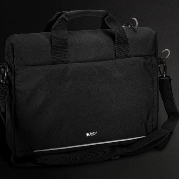 Perfect for your daily business commute, RFID laptop bag has a 15.6inch padded laptop compartment. Made from 600D polyester, this bag features an internal zippered pocket, a top zippered closure, a side zippered pocket, a removable shoulder strap and twin padded top handles. Fitted with a reflective safety strip below the Swiss Peak logo on the front of the bag.