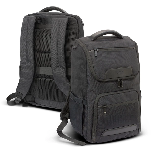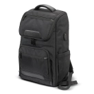 Make the daily commute easier and more stylish with the Swiss Peak Voyager Laptop Backpack. It is manufactured from premium 1680D polyester fabric with smart PU accents and 210D polyester lining. The large main compartment has a zip-around closure and includes a padded pocket that will comfortably hold a 15-inch laptop, two slip pockets that offer RIFD protection and a USB outlet. The back of the backpack is heavily padded for extra comfort and the padded shoulder straps are fully adjustable. Other features include two side pockets with elastic openings to hold water bottles and other accessories, three external zippered pockets, a padded carry handle and a rear luggage sleeve that slides over the handle of a rolling suitcase. The Swiss Peak logo is subtly debossed on the front of the bag and branded on the laptop pocket.