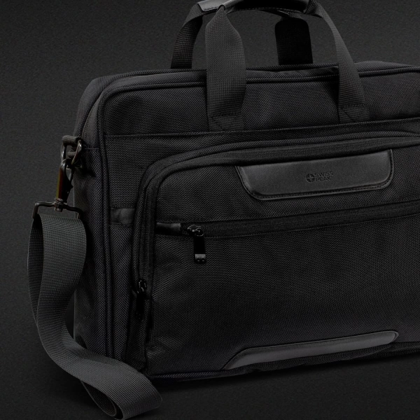 Make the daily commute easier and more stylish with the Swiss Peak Voyager Laptop Bag. It is manufactured from premium 1680D polyester fabric with smart PU accents and 210D polyester lining. The large main compartment has a zippered closure and features a padded pocket that will comfortably hold a 15-inch laptop. It has another zippered compartment with two internal slip pockets that offer RFID protection, a pen holder and an external zippered side pocket. The bag has woven carry handles with comfortable PU hand grips, an adjustable and removable shoulder strap with a soft shoulder pad and a rear luggage sleeve that slides over the handle of a rolling suitcase. The Swiss Peak logo is subtly branded on the laptop pocket and is debossed on the front pocket.