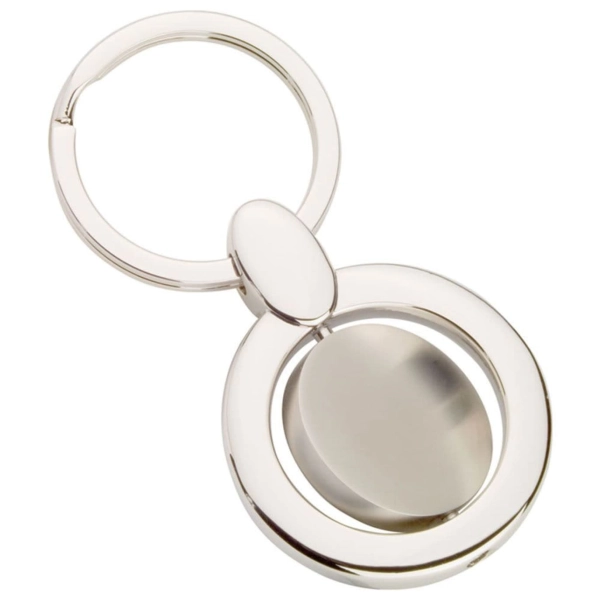 Metal silver plated with matt silver swivel piece. Very popular swivel round keyring.