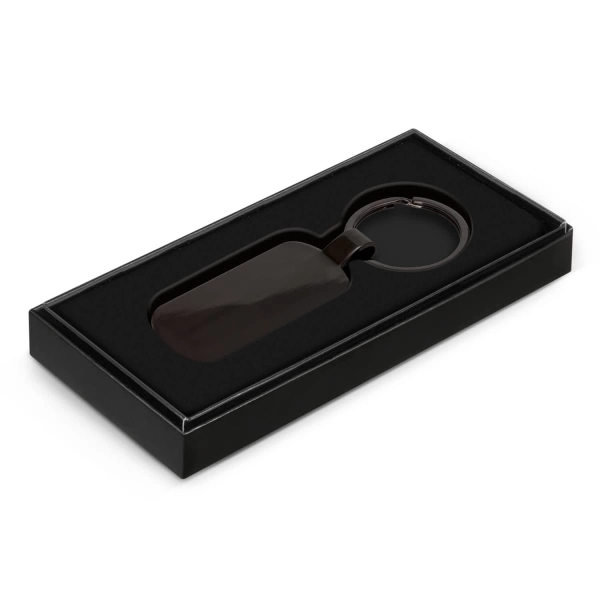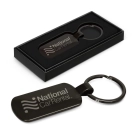 Metal key ring with a gunmetal plated finish on both sides which can be laser engraved to a natural etch. It is beautifully presented in a black gift box.