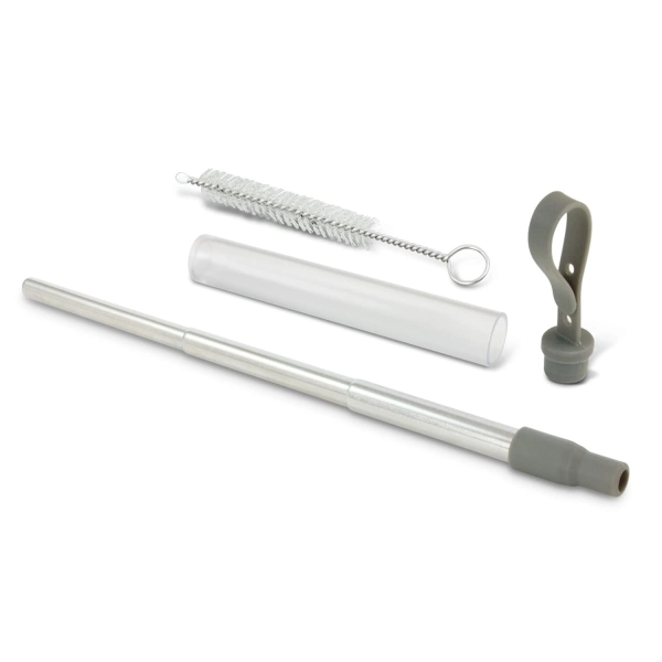 Reusable stainless steel straw with a removable silicone mouthpiece and cleaning brush. The straw telescopically folds down to fit inside its own clear carry tube which seals shut with a silicone stopper. This has an adjustable loop so the carry tube can be attached to a key ring or bag. Steel straws are a reusable alternative to single-use plastic straws and are a great way to send a positive message. Branding is on the case.
