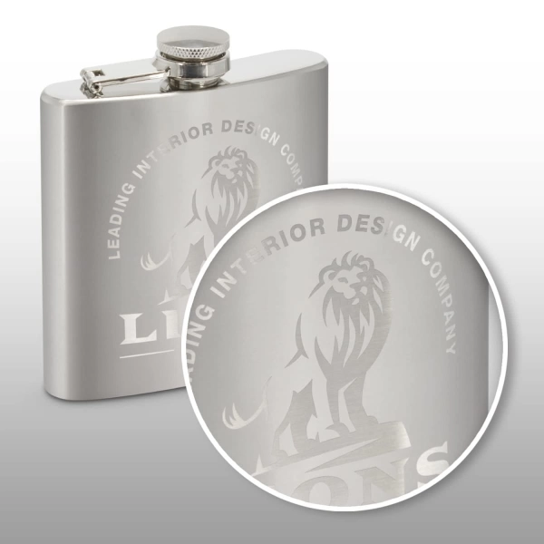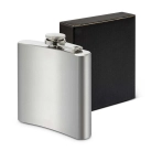 180ml stainless steel hip flask with a hinged screw top lid. It laser engraves to a natural etch and is presented in a black gift box.