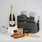 Packed for celebrating – wherever the moment takes you. Unzip the sleek grey cooler bag and you’ve got everything for a shared toast and a little grazing on the side. A bottle of Chandon. Two elegant stemless glasses from the iconic Krosno glassware brand. A rich acacia serving board with gold cheese knives. Savoury crackers and a jar of relish to match. Plus, a soft grey towel for those laid-back, sunny escapes. The Chandon Escape is effortless and elevated – perfect for settlement gifts, summer rewards, or client moments that call for a little sparkle. What’s Inside? 1 × Gabel and Teller Acacia serving board – smooth-grained and perfect for sharing cheeses or nibbles. 1 × Gabel and Teller Satin gold cheese knife set – two-piece stainless steel set with a refined satin finish. 1 × Cracked black pepper crackers – light and savoury with just the right crunch. 1 × TRCC tomato relish mini – rich, flavourful, and a perfect pairing for cheeses and crackers. 1 × Set of Krosno stemless wine glasses (set of 2 gift boxed) – sleek, modern, and ideal for casual celebrations. 1 × Nicola Spring Grey Turkish-style towel – soft, lightweight, and versatile for picnics or beach days. 1 × Chandon sparkling wine (750ml) – crisp and celebratory. Presented in a grey Duo RPET 2-compartment cooler bag – insulated and reusable.