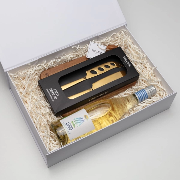 A gift that feels like a moment – personal, polished, and perfectly considered. Lift open the crisp white box and you’ll find everything needed for a quiet toast or a shared celebration. A weighty gold cheese knife set. A bottle of carefully chosen wine. And nestled below, a warm acacia wood cheeseboard – the kind you’ll want to use again and again. The Classic Pairing is thoughtful without trying too hard. Whether it’s a welcome, a milestone, or a genuine thank you – this is the kind of gift that leaves an impression. The Classic Pairing is thoughtful without trying too hard. Whether it’s a welcome, a milestone, or a genuine thank you – this is the kind of gift that leaves an impression. What's Inside? Acacia Serving Board: A premium wooden board that makes a thoughtful and practical gift for any occasion. Luxe Gold Cheese Knife Duo: A simple, stylish pair that feels satisfying to hold and use. Premium Wine Selection: Choose from red or white wine to suit the occasion. Premium Presentation: Packaged in a white magnetic-close gift box with soft vanilla cream shred.