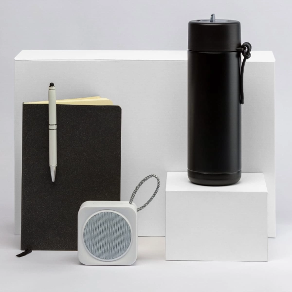 WFH just got a glow-up. Whether they’re kitchen-table hustling or couch-CEOing, this kit has everything they need to look the part and stay in the zone. A sleek desk bottle. A recycled leather notebook for next-big-idea scribbles. A mini speaker for background beats. And the kind of pen that mysteriously disappears because everyone wants one. The Daily Setup is perfect for onboarding, client gifting, remote teams, or just reminding someone they’ve absolutely got this – wherever they log in from. What’s Inside? 1 × Astro Soft Cover Recycled Leather Notebook – A5 size, with document holder and 160 lined pages. 1 × Columbia Aluminium Pen – twist-action, with built-in stylus; available in black, white, or blue. 1 × Pep Mini Bluetooth Speaker – 5W, soft-touch finish with carry loop and charging cable. 1 × Zara 600ml Stainless Steel Vacuum Bottle – with sip lid, straw and silicone carry strap; black or white. Presented in a white magnetic-close gift box with vanilla cream shred.