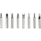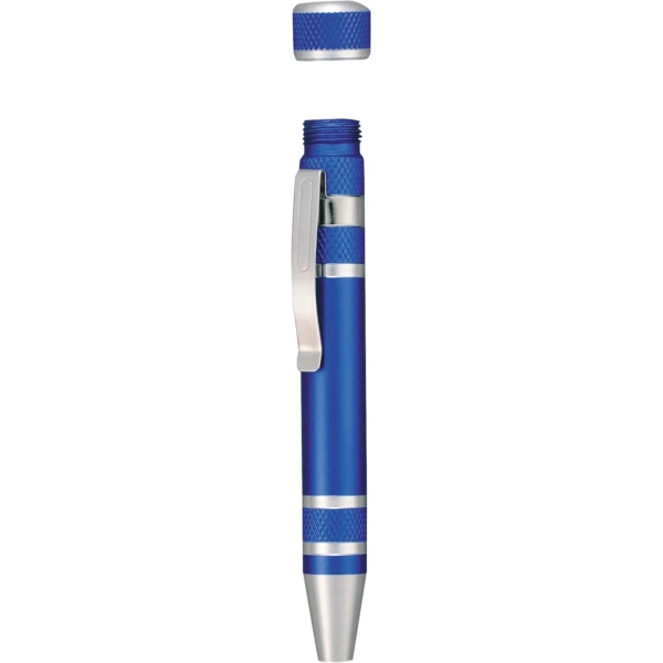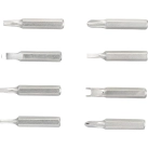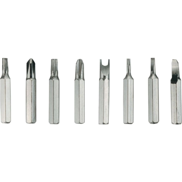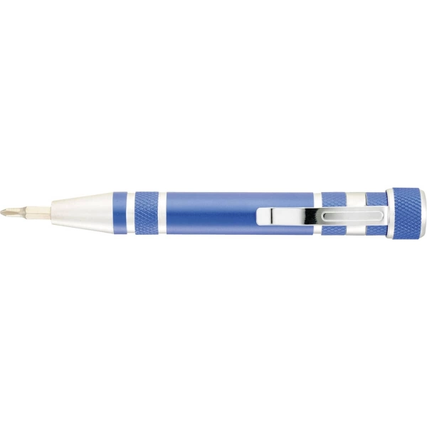 Includes 2 Phillips bits, 3 star head bits, 1 flathead bit, 1 bent flathead bit, and 1 spanner bit. Twist-off cap for bit storage. Magnetic base. Durable metal clip. Laser engraving recommended.