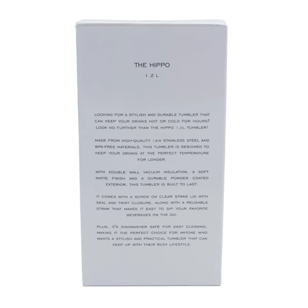The 1.2L Hippo Bottle is built for all-day hydration, keeping drinks hot or cold for hours with its double-walled design. Made with a 304 stainless steel inner and 201 stainless steel outer, it features a powder-coated finish for a sturdy feel. The screw-on clear straw lid with a twist closure, along with a removable straw and topper, offers flexibility in how you drink.