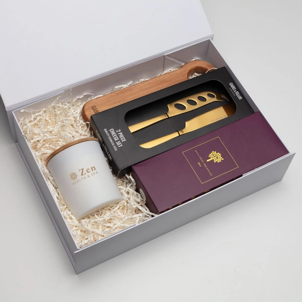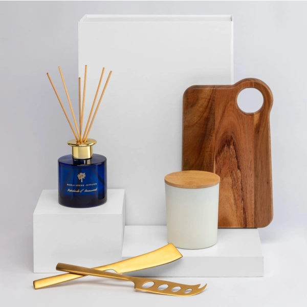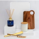 Cheeseboard essentials meet luxe home fragrance in this all-in-one crowd-pleaser. Lift open the lid and you’ll find the perfect balance of entertaining and ambience. A smooth acacia cheeseboard. Luxe gold cheese knives. A softly scented vanilla candle. And a glass reed diffuser that fills the room with warm patchouli and rosewood for up to 70 days. The Host Edit is all about pairing style with function – perfect for housewarmings, settlement gifts, or any moment that deserves a little glow. It’s curated, considered, and ready to impress. What’s Inside. 1 × Acacia wood cheeseboard – smooth, rich, and grainy by nature. 1 × Gold cheese knife set – striking and weighty in hand. 1 × Gleam glass candle – vanilla scented with natural bamboo lid. 1 × 200ml Patchouli & Rosewood reed diffuser – long-lasting, slow-release scent (up to 70 days). Presented in a white magnetic-close gift box with soft shred.