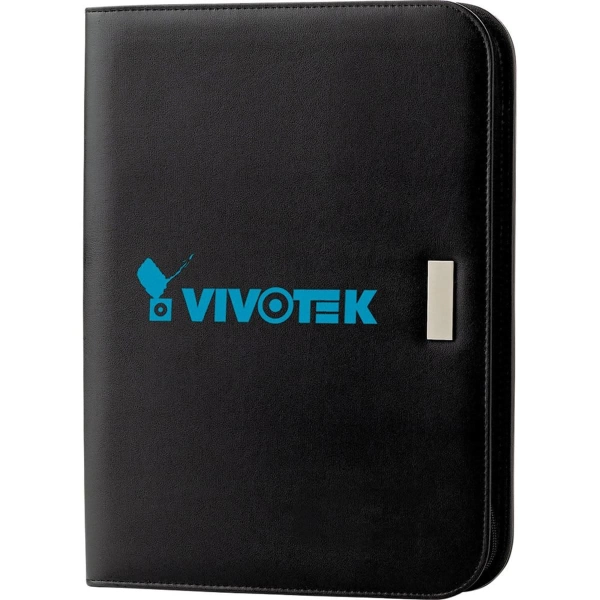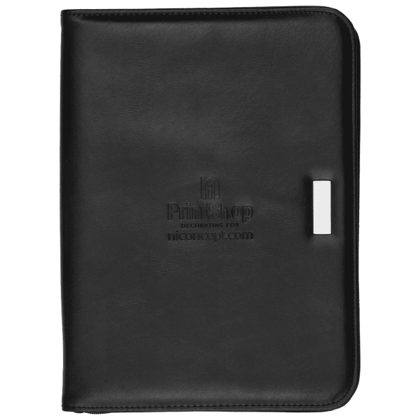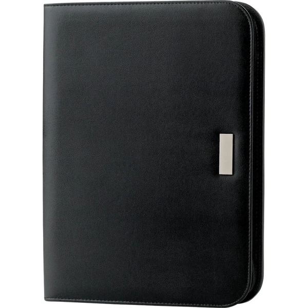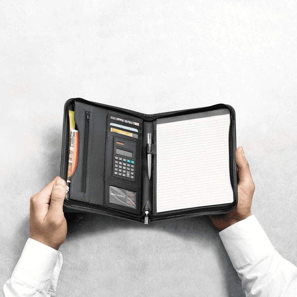 Stylish A4 compendium with solar calculator. Zippered closure. Includes refillable 30 page writing notepad. Front open document pocket. Internal expanding pocket, zippered pocket and pen loop. Pen not included.