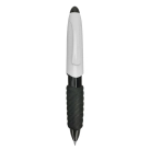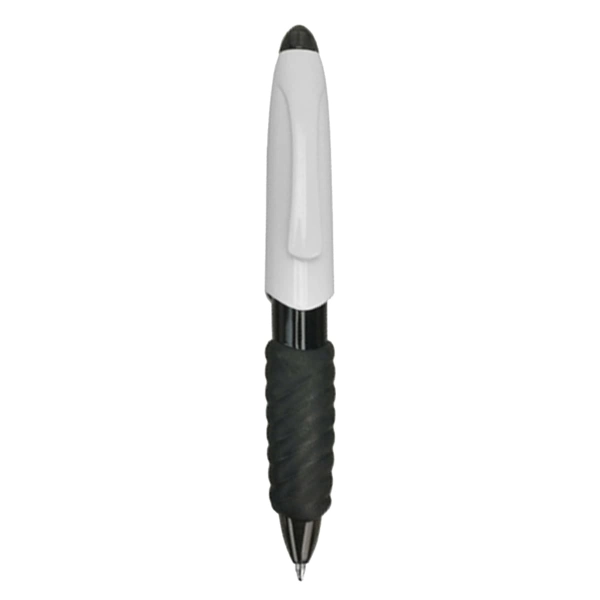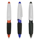 A special unique design plastic promotional pen with retractable action white short barrel and coloured top tip and neck black soft rubber grip with Parker-Type refill high quality German manufactured black ink refill and tungsten carbide ball which brings you the better writing quality 1200 meters writing distance.