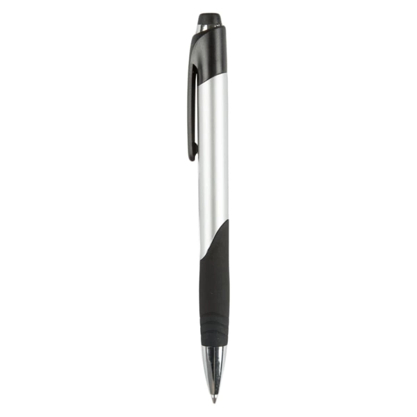 This click-action pen features black ink and an ergonomic grooved rubber grip for a smooth, comfortable writing experience. A practical essential with a professional finish, ready for branding.