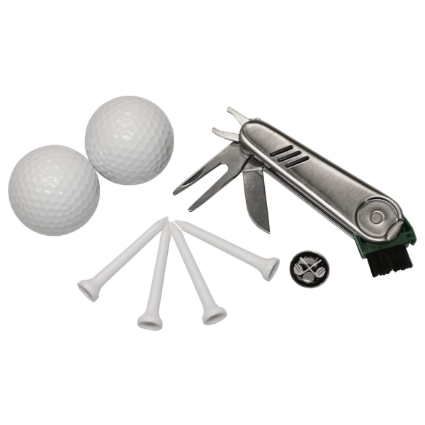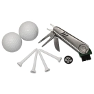 This quality golf pack is designed to attach to your golf bag and includes 2 golf balls, 4 tees and a handy stainless steel golf tool with ball marker.