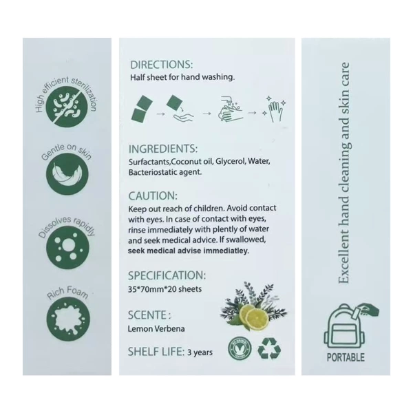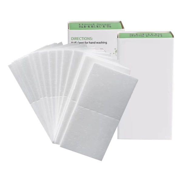 This 20-sheet travel hand paper soap pack is the ultimate on-the-go essential. Compact and portable, it easily fits into any bag or pocket, seamlessly blending into busy lifestyles. Simply grab a sheet, add water, and watch it dissolve into a rich foam for a thorough hand wash. Infused with a refreshing lemon verbena scent, it leaves hands clean and smelling amazing. This paper soap sheets are Infused with natural moisturizers that leave skin soft and supple. The gentle formula creates a luxurious lather that won't dry out your skin, ideal for both adults and kids, even for the most sensitive skin. All ingredients contain no harsh chemicals. Add your branding to the front for a thoughtful, functional product that keeps your brand top-of-mind with every use.