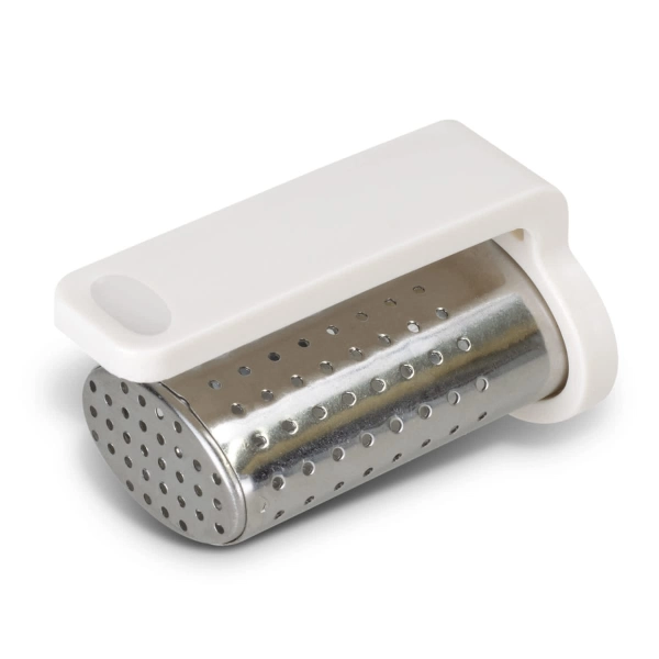 Compact tea infuser for loose leaf tea that easily clips onto the side of most mugs.