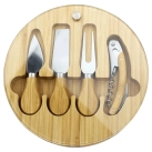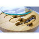 Bamboo cheese set with glass swivel cover for protection and supplied with 3 cheese tools and a waiters friend all with bamboo handles.