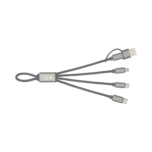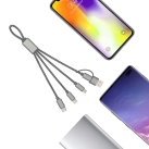 This Trident 2 Eco high-speed charge cable is manufactured with an ultra-strong reinforced structure using RPET and 100% RCS-certified recycled nylon. This 20 cm long cable delivers up to 2.1 Amps and provides a Type-C and tethered USB-A input connector with a Type-C, Micro and 8 pins (iOS) output. In addition, its aluminium retainer, reinforced braided jacket, and softer touch give Trident its sophisticated look and feel. Suitable for use with all mobile devices. This cable is now packed in a recycled kraft box. Material: Aluminium, RPET, Recycled Nylon.