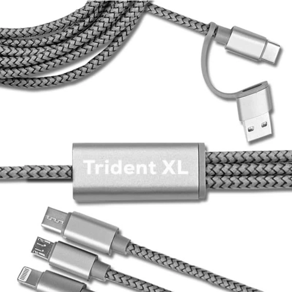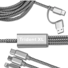 Introducing the Trident Eco XL Charging Cable! This 3-metre-long charging cable is made from recycled PET bottles and provides fast charging up to 3.5A. With its generous length, and reinforced clutter-free braided cable, you can easily reach any outlet or device without hassle. This versatile 4-in-1 cable can connect to any device with USB-A or Type C to Micro USB, Type C, or Lightning port. No matter what device you need to power up, the Trident Eco XL Charging Cable is ready. Material: Aluminium, RPET.