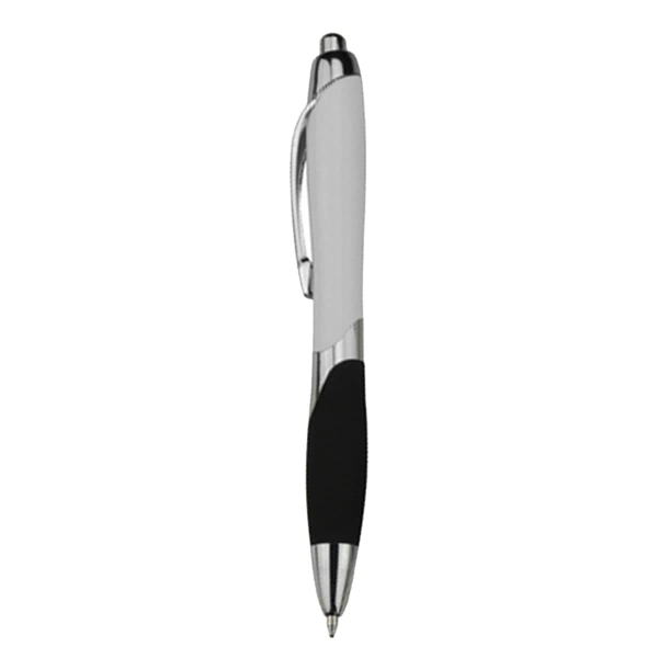 Click action plastic pen with solid white barrel and coloured soft-touch grip shiny silver chrome trim and metal clip high quality German manufactured black ink refill and tungsten carbide ball which brings you the better writing quality 1200 meters writing distance.