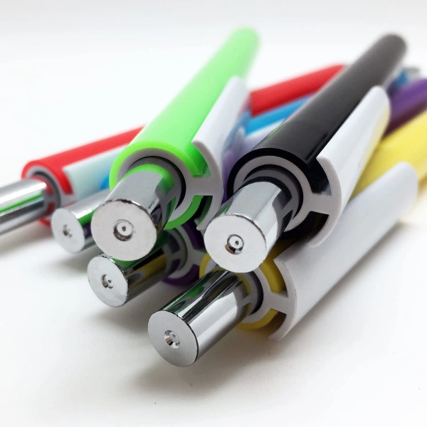 Retractable quality European style plastic pen shiny coloured barrel with white clip shiny silver chrome tip and push button a simple but stylish design. It has high quality German manufactured black ink refill 1800 meters writing distance tungsten carbide ball provides you with quality writing.