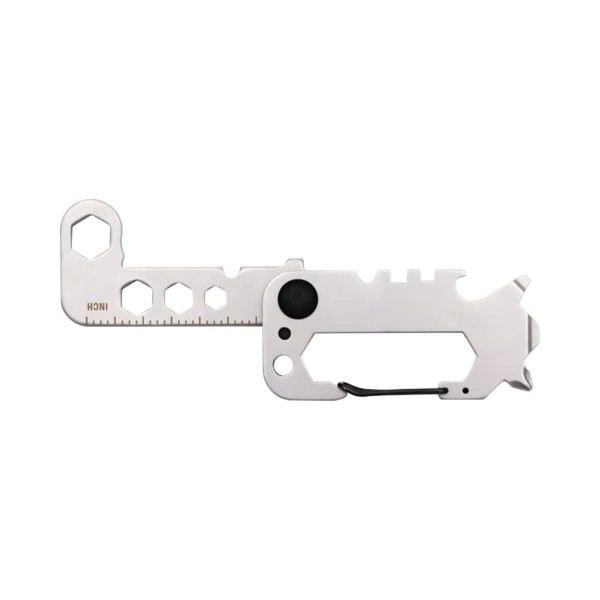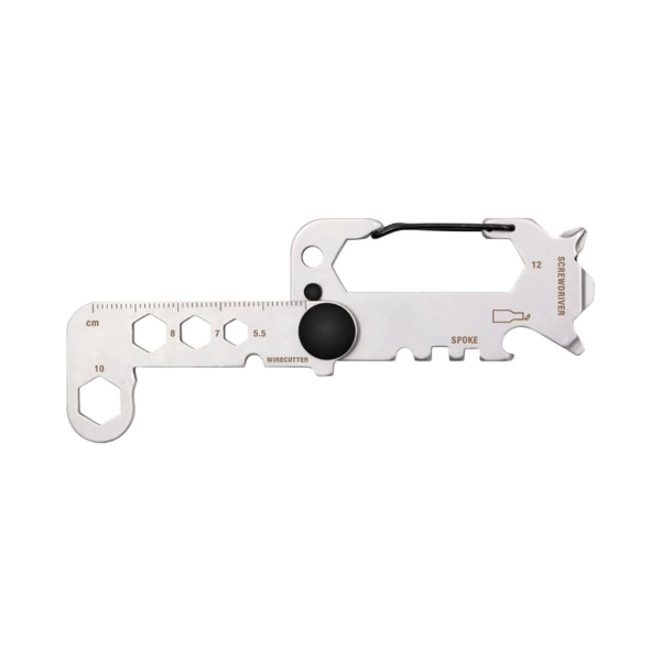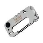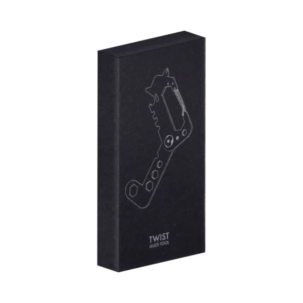 Made of hardened martensitic stainless steel 420, the sleek Twist Multi-tool features 8 tools that do everything from tighten bolts and screws to open a bottle of refreshment, all in a simple twist design that fits in the palm of your hand. Twist design includes; wire cutter, bike spoke wrench, spanner, key chain, bottle opener, carabiner hook, philips screwdriver, flat screwdriver and ruler. Materials: Hardened Steel.