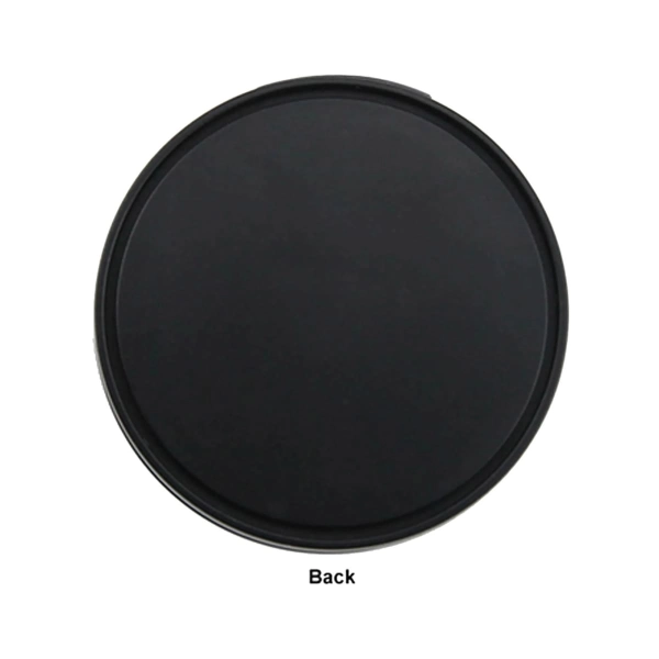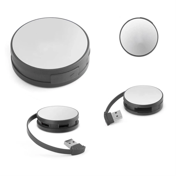Round plastic USB hub with four ports and a USB 2.0 interface the cable locks into the housing neatly when not in use silver top and black back.