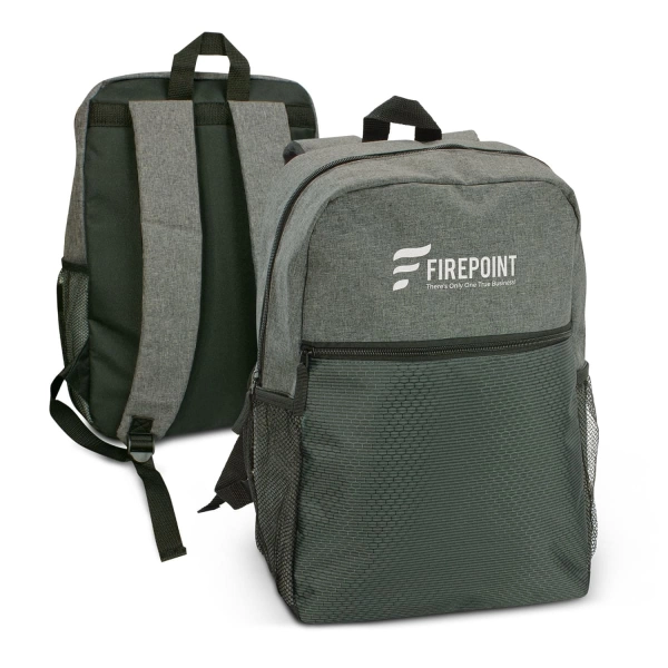 Sophisticated backpack which is manufactured from a combination of on-trend heather style 300D polyester and 600D polyester. It has a distinctive front pocket with an eye-catching patterned finish which has two internal slip pockets with pen holders and a zippered closure. Velocity has a large zippered main compartment with a padded laptop sleeve. Other features include a padded back for comfortable carrying, adjustable shoulder straps with breathable padding for extra comfort, a woven carry handle, two mesh side pockets and smart zipper pulls.