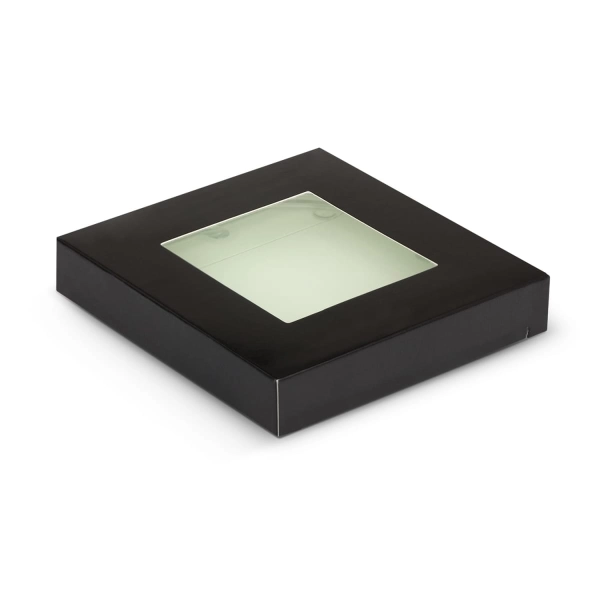 Set of two round glass coasters in an elegant black gift box with a window to show off the brand. The coasters have three non-marking polyurethane pads on the base. Handwashing is recommended.