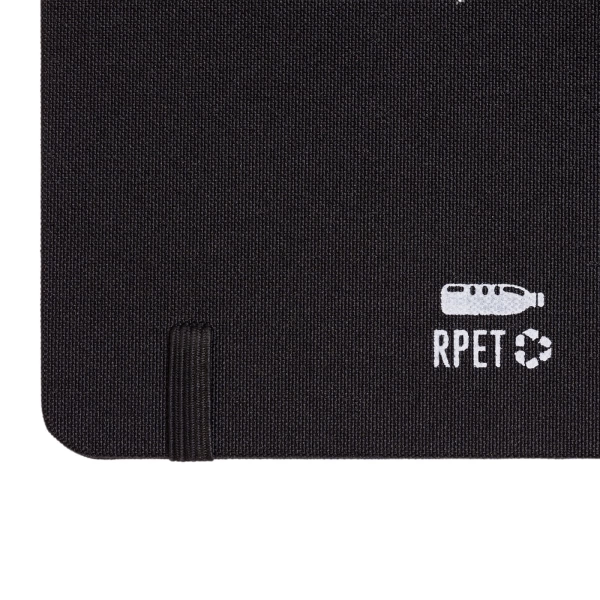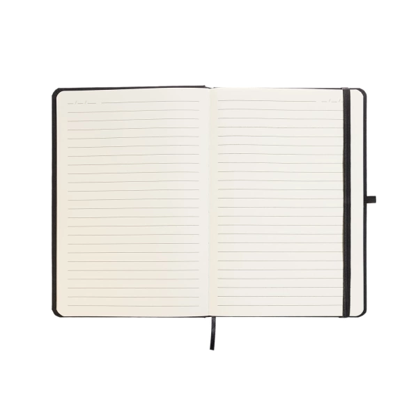 The Venture RPET A5 Notebook features an all-black cover made from recycled plastic (RPET), offering an eco-conscious writing solution. It includes 80 sheets of 70gsm ruled paper with a date field on each page, printed in the same colour as the lines. The back cover proudly displays the RPET and Mobius loop symbols, printed in white. The notebook is completed with a black elastic retaining strap, ribbon page separator, and pen loop.