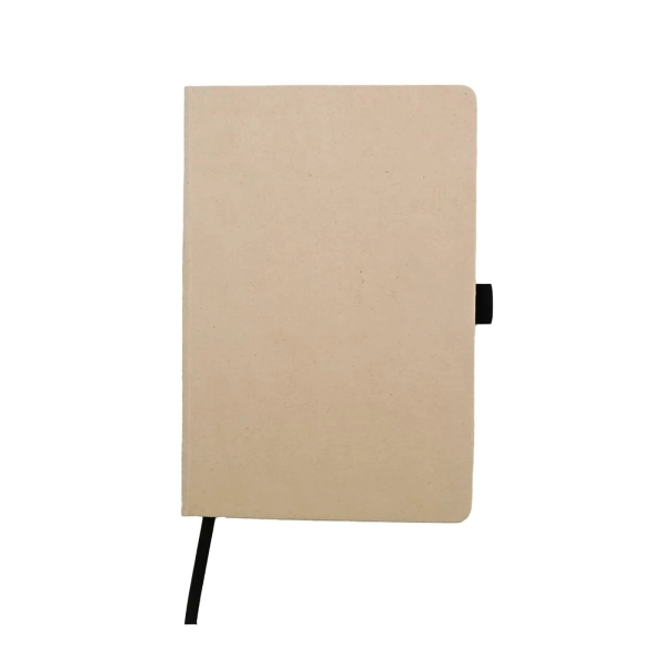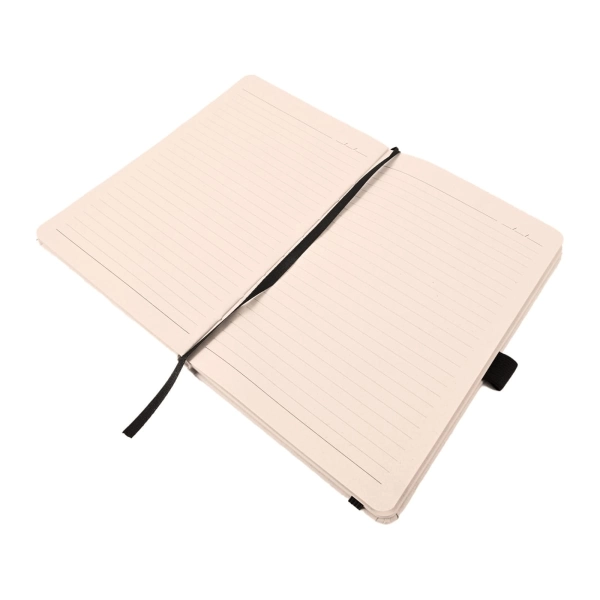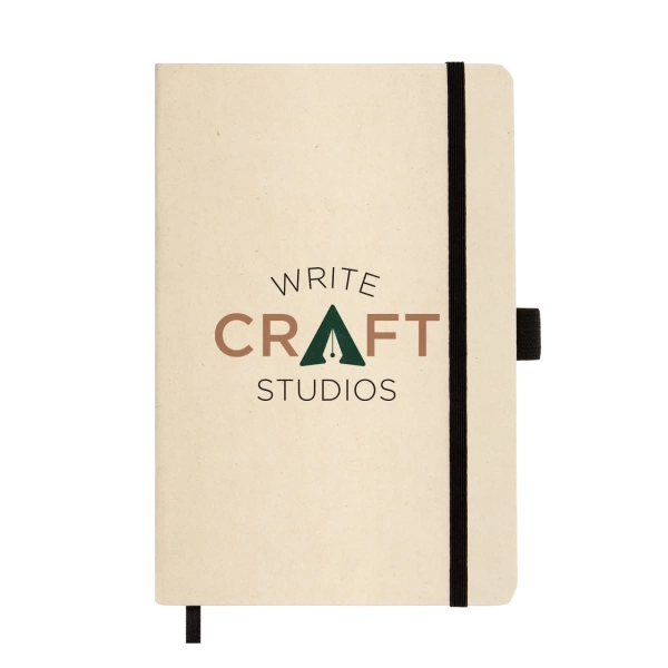 The Venture Sugarcane A5 Notebook, a sustainable and practical choice for your note-taking needs. This A5-sized notebook features 80 lined pages of high-quality 80 GSM paper, with a printed date field at the top of each page for organized planning. Crafted from recycled sugarcane materials, it embodies eco-conscious design. The notebook includes a black ribbon page divider for easy navigation, a black elastic closure strap for secure storage, and a black elastic pen loop for added convenience. The recycled sugarcane logo is embossed on the back cover, proudly showcasing its commitment to environmental responsibility. Choose the Venture Sugarcane A5 Notebook for a stylish and eco-conscious solution that combines functionality with sustainability in every detail.