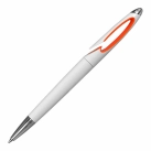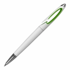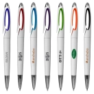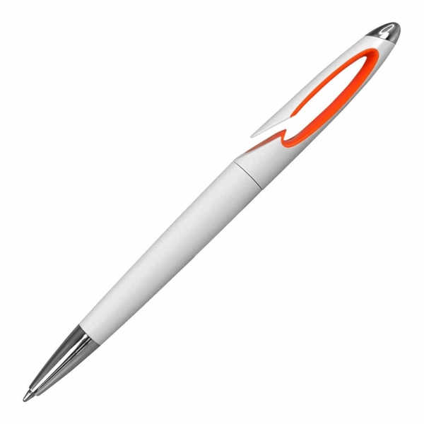 Twist-action plastic pen designed for convenience, featuring an easy slip-over clip for secure attachment to pockets or notebooks. The sleek white barrel is complemented by a coloured insert for a stylish touch.