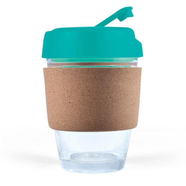 320ml glass reusable coffee cup. Heat-resistant cork band and secure fitting lid. Made from Borosilicate glass known for its durability and thermal shock resistance. Select your choice of lid and flip piece colour. Packed in a kraft gift box. For logo longevity, hand washing is recommended. Eco Credentials: Reusable, sustainable, printed using renewable energy.