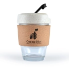320ml glass reusable coffee cup. Eco comfort lid made from a 50% blend of wheat fibre and polypropylene. Borosilicate glass is known for its durability and thermal shock resistance. Nominate your choice of flip piece colour. Packed in kraft gift box. For logo longevity, hand washing is recommended. Eco Credentials: Reusable, sustainable, printed using renewable energy.